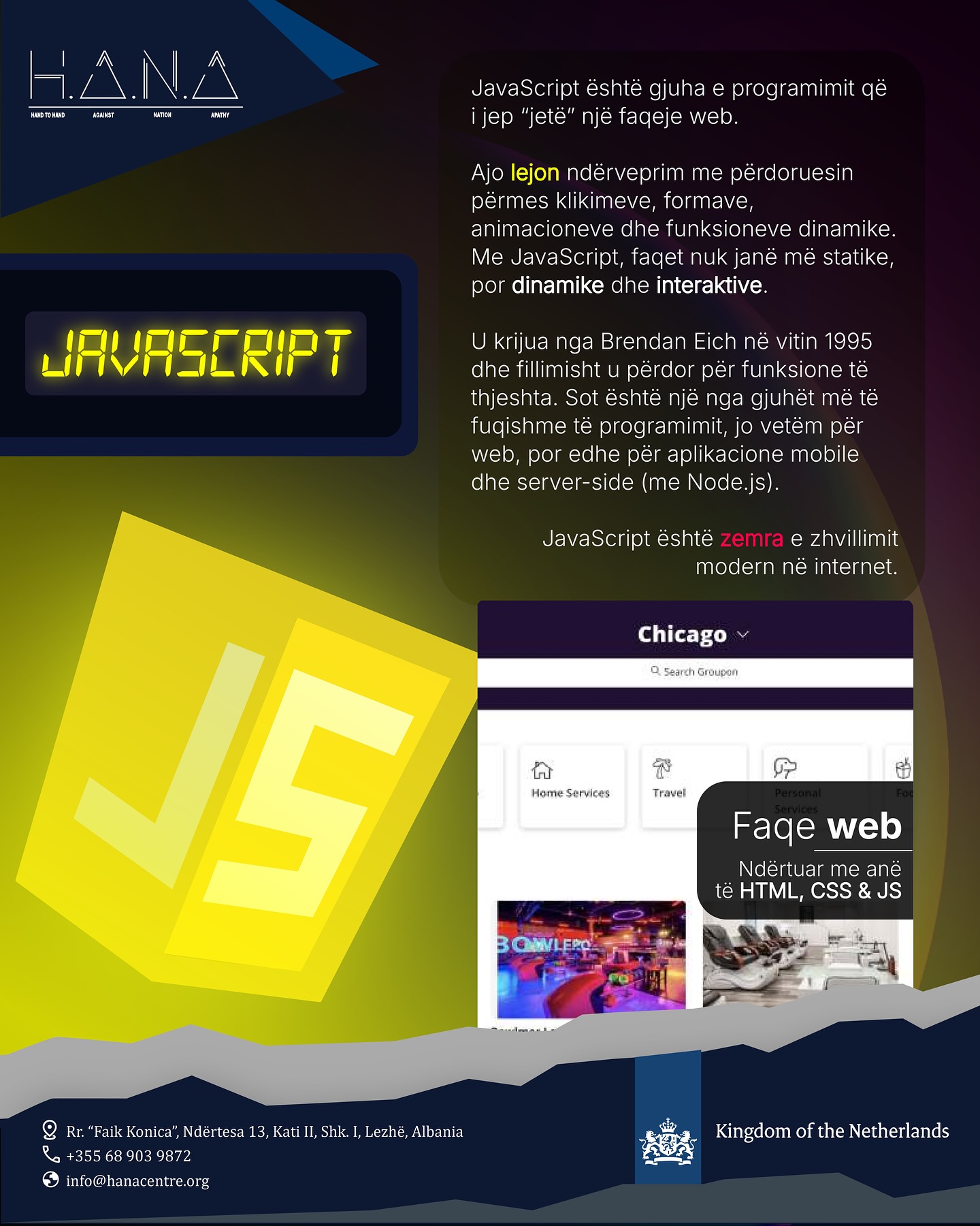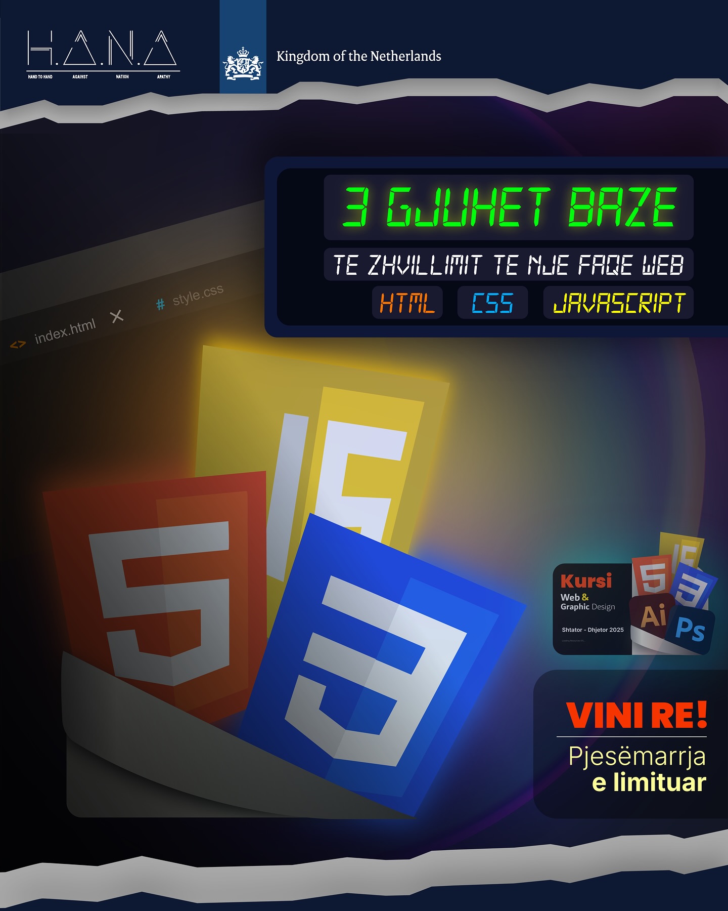 The course will be led by Jetmir Shtjefni, an experienced professor and trainer in technology, design, and digital marketing. He will guide participants step by step into the world of web development and graphic design.